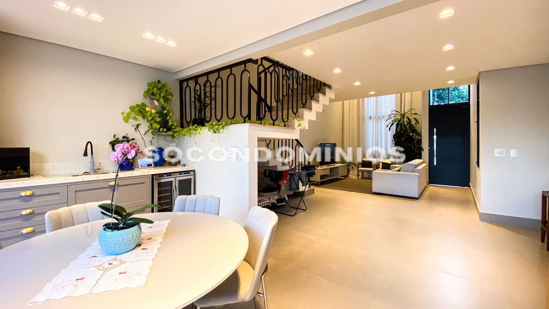 No pavimento térreo, a casa conta com sala de estar com pé-direito duplo, trazendo mais iluminação natural e sofisticação ao ambiente. A cozinha integrada é equipada com armários planejados, além de lavanderia e banheiro completo.