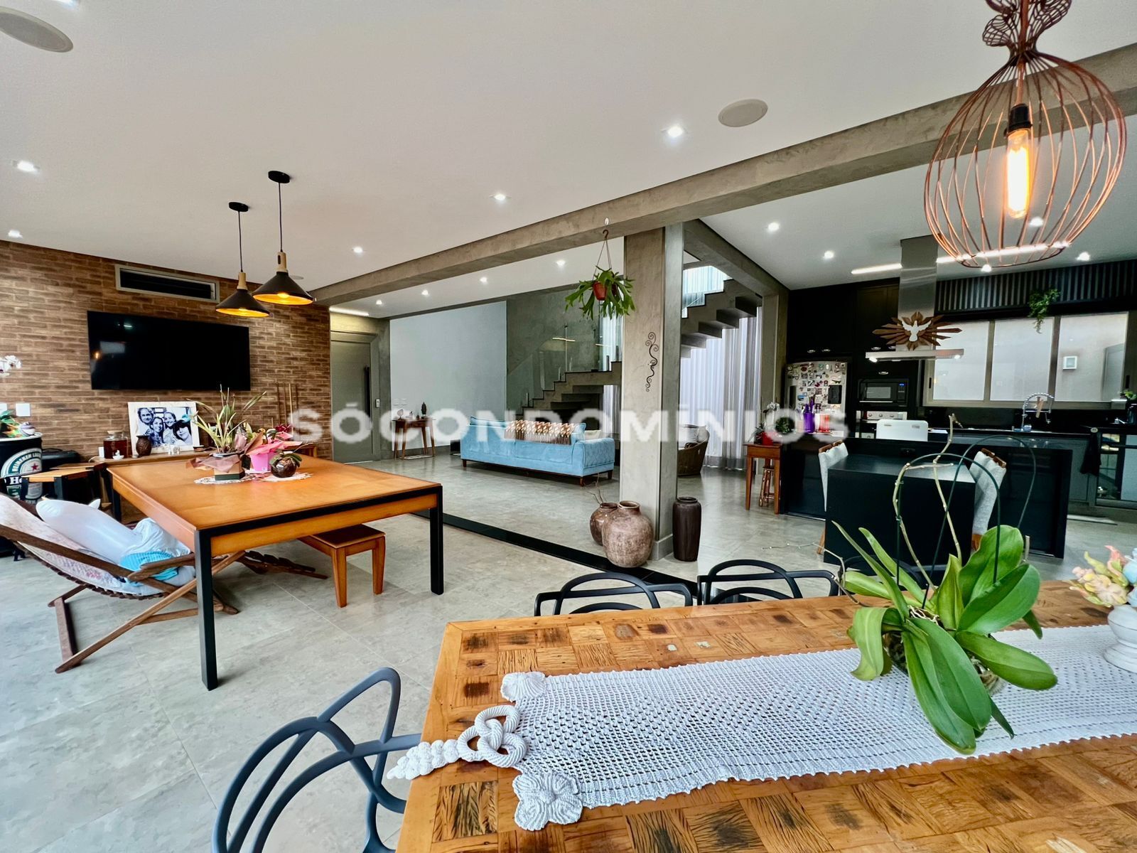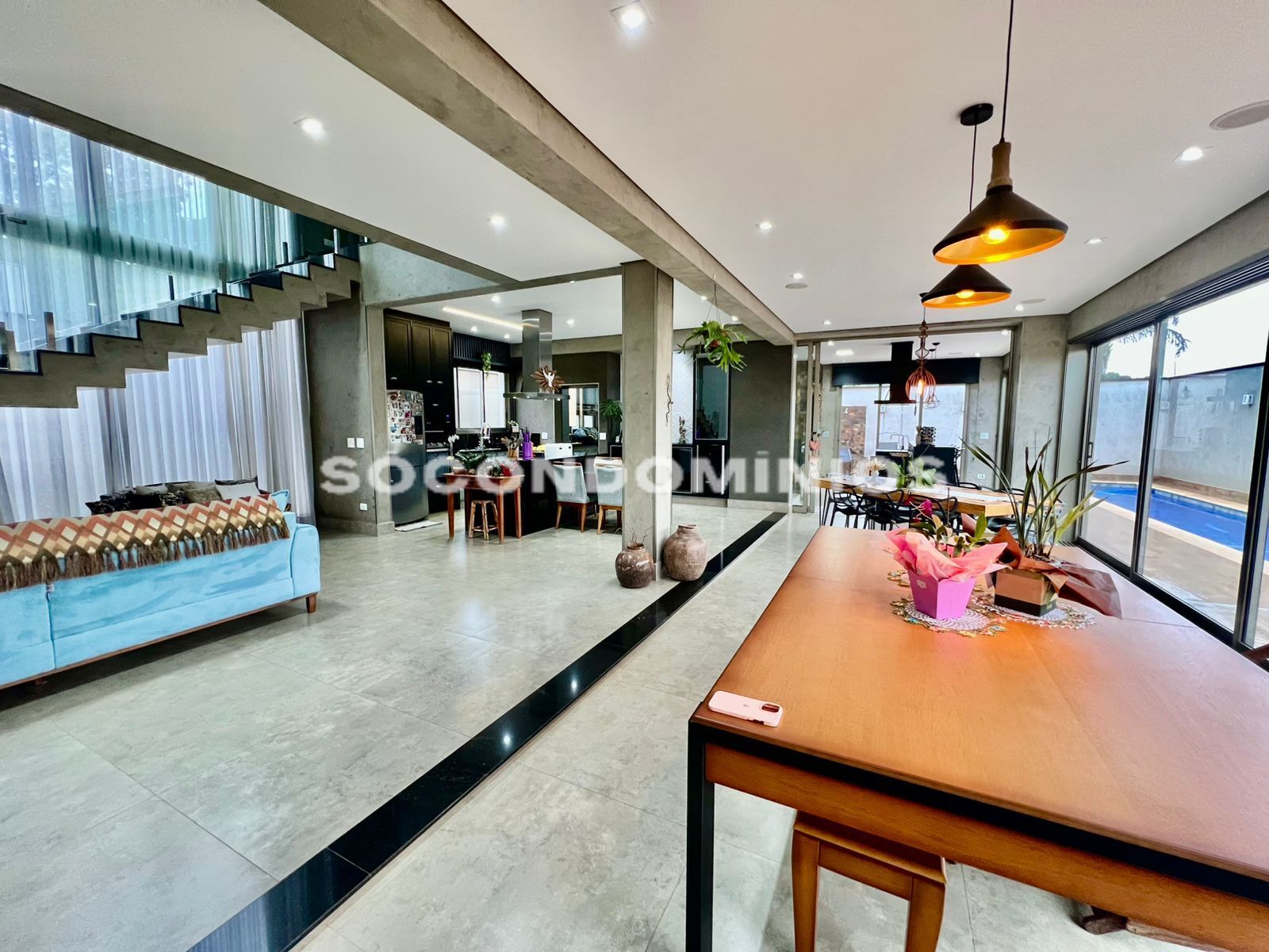 Sala com pé direito duplo para 4 ambientes integrados