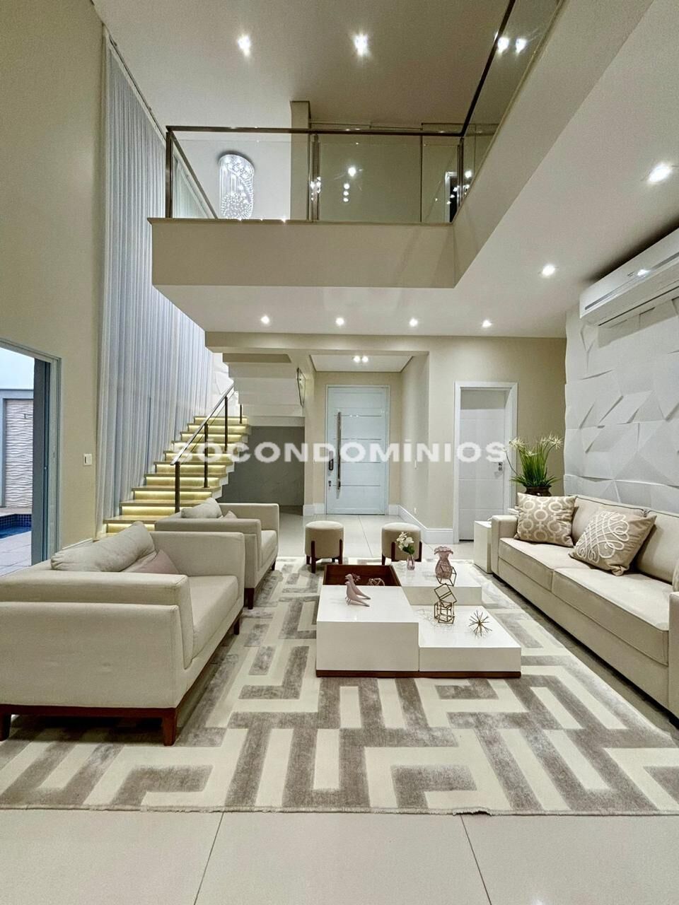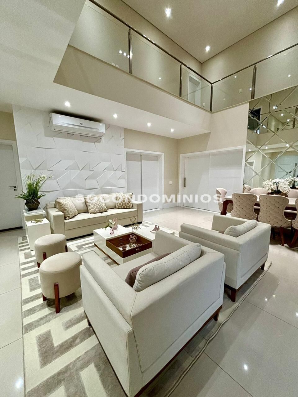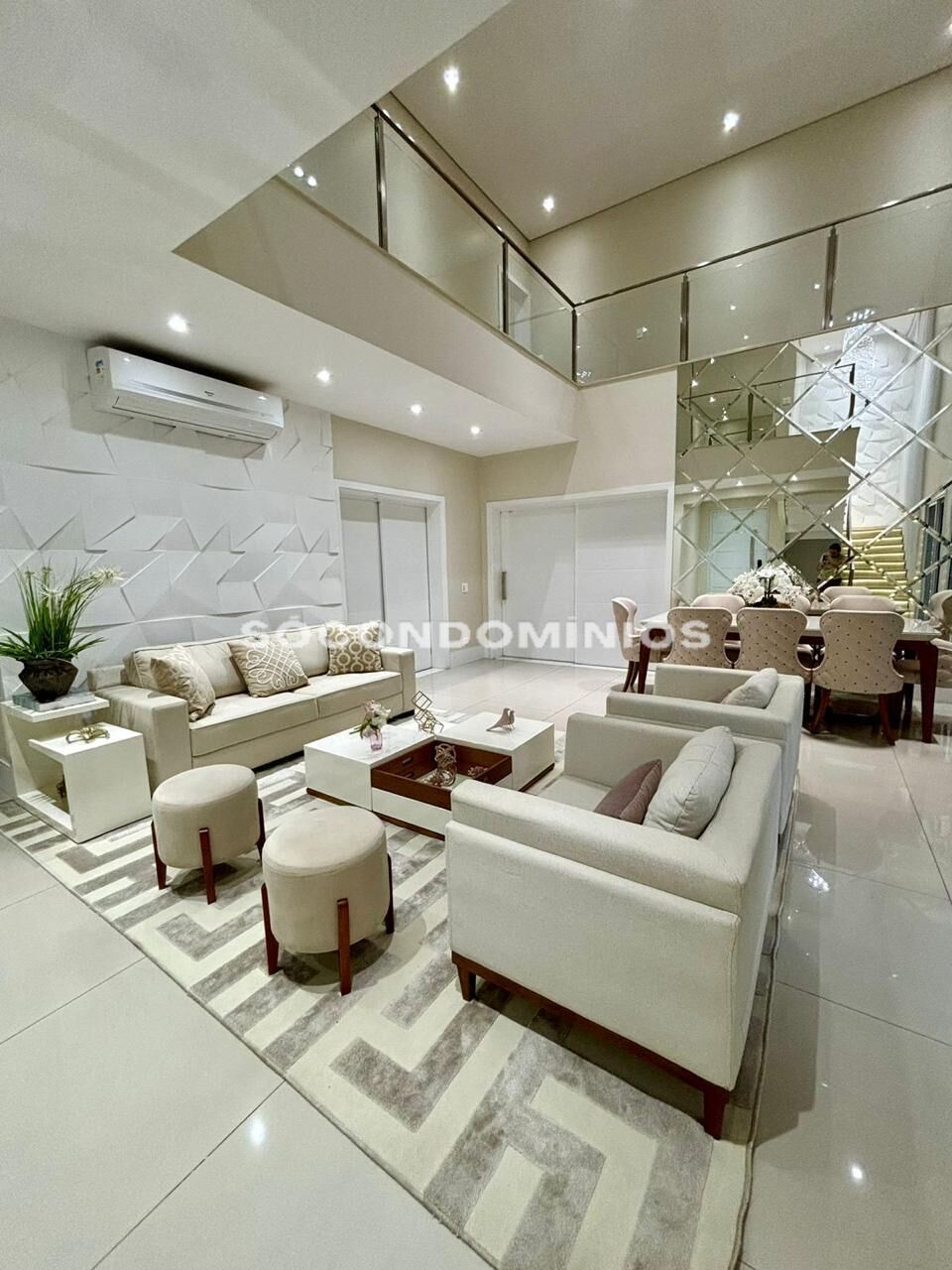 Pavimento térreo conta com sala de estar integrada a sala de jantar com pé direito alto;
