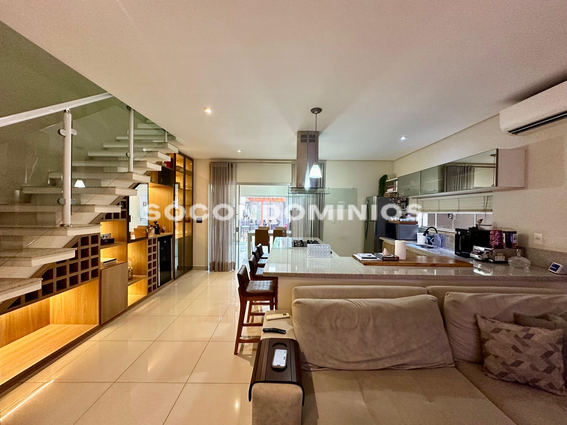 Ambiente integrada a cozinha americana totalmente equipada com armários, cooktop e coifa;