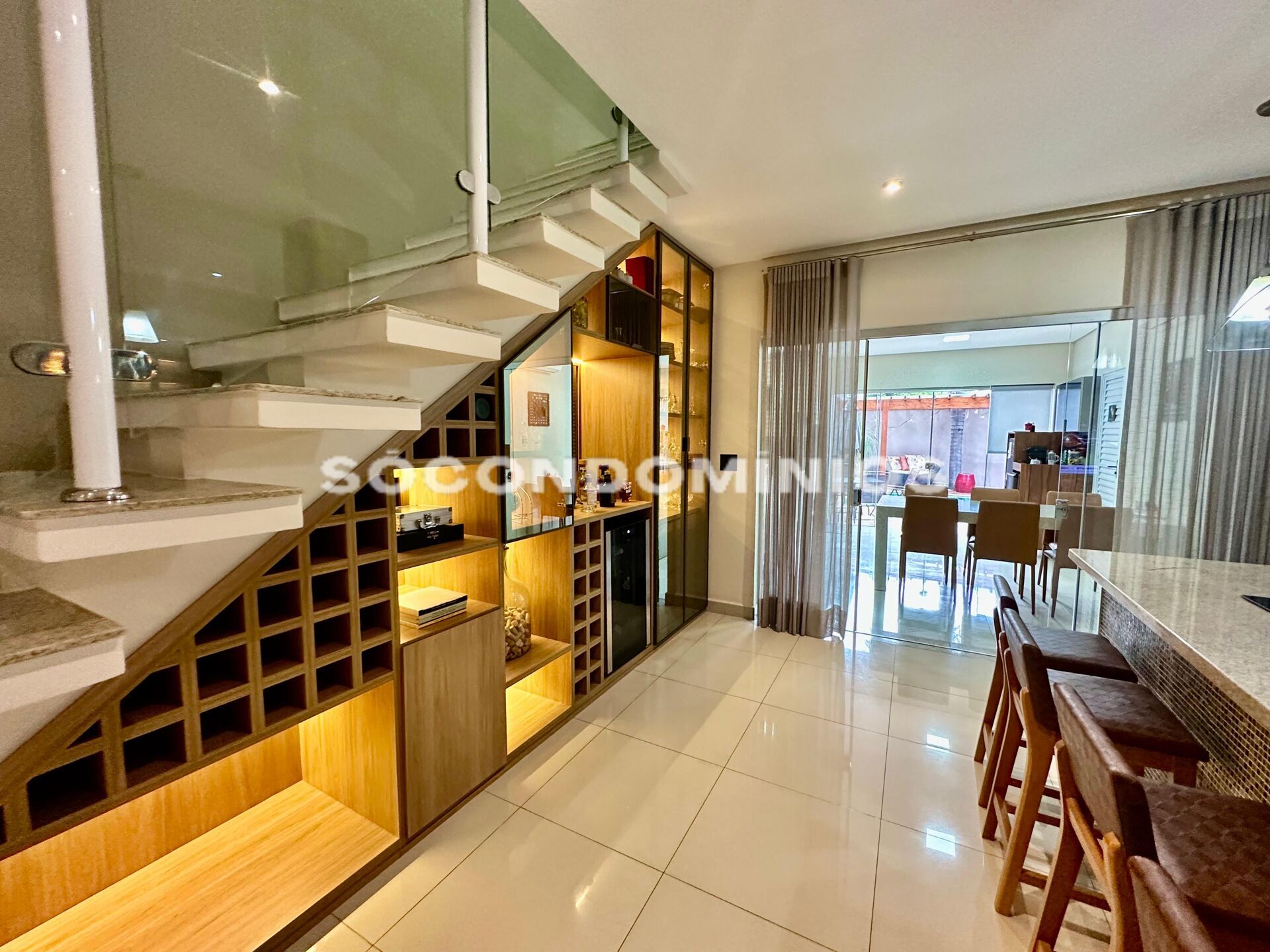 Barzinho na parte superior da escada com espaço para adega;