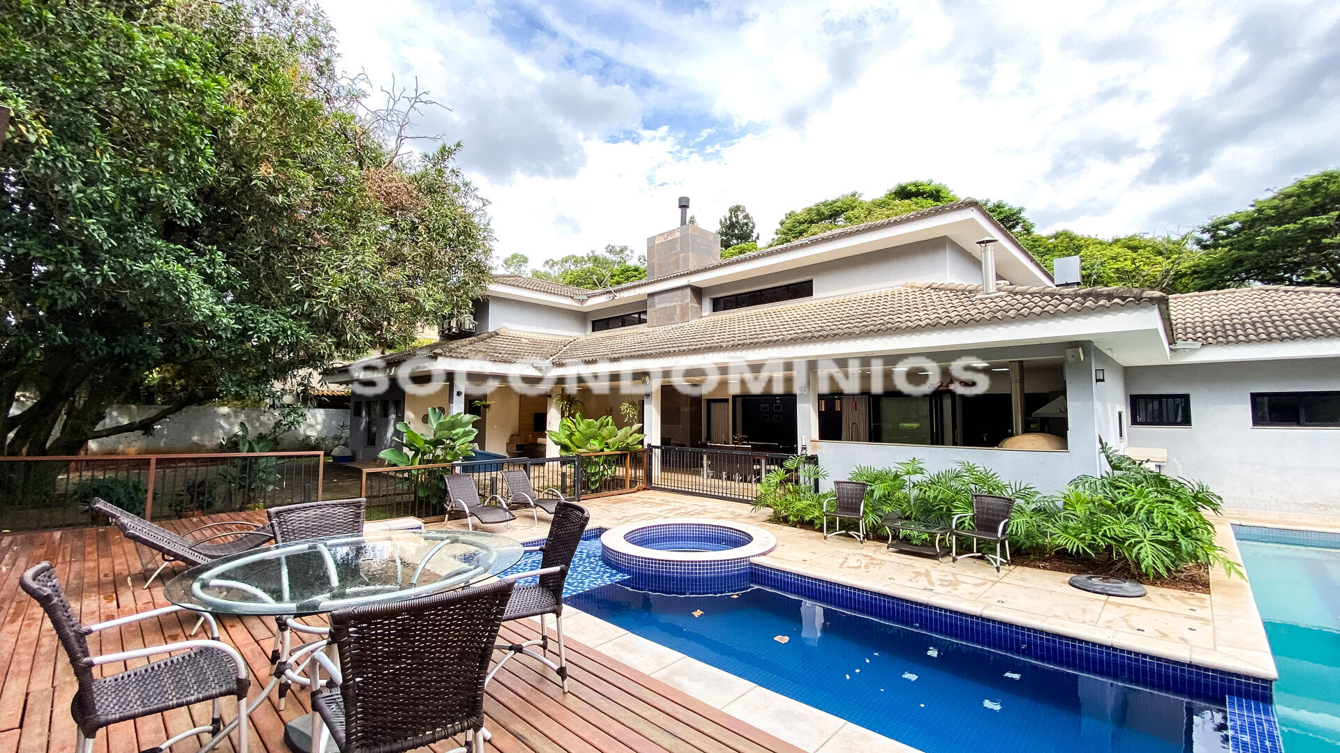 Piscina com deck de madeira, raia de 24 metros e ofurô