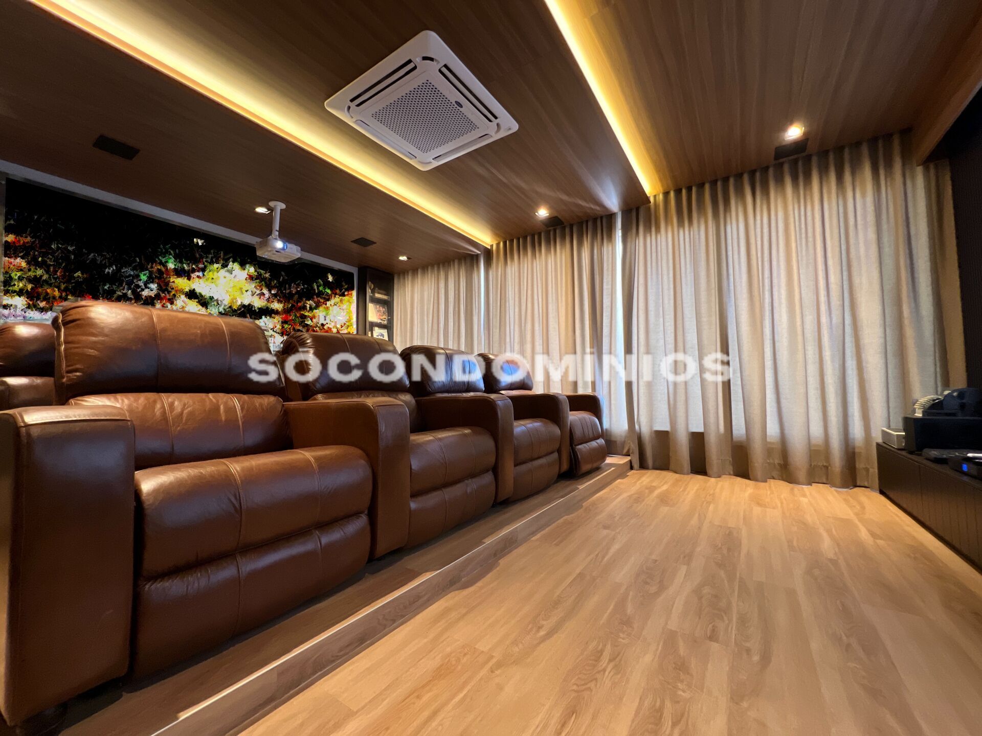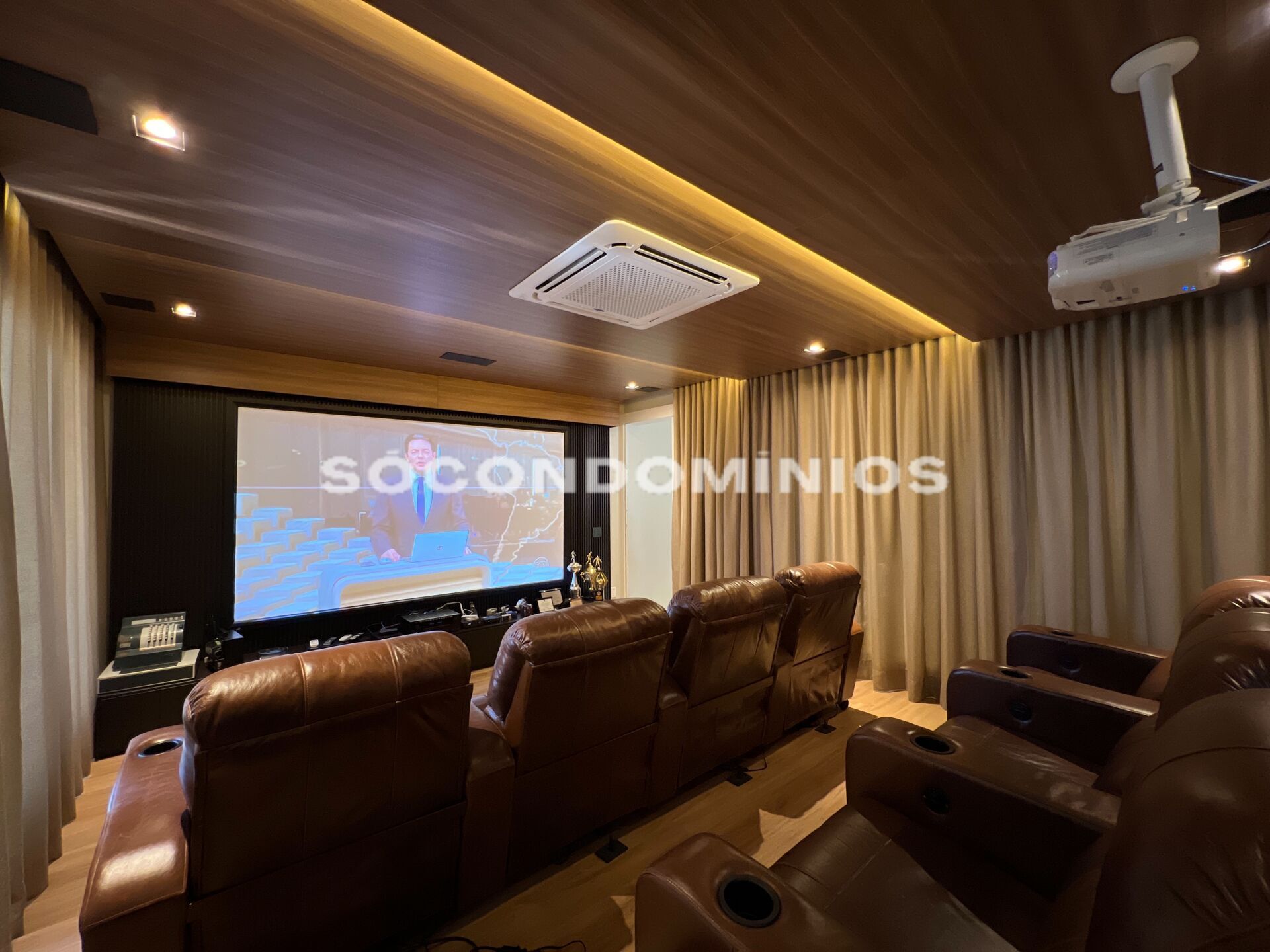 Sala de Cinema com 8 poltronas reclináveis, projetor e telão. Sistema Surround Sound;