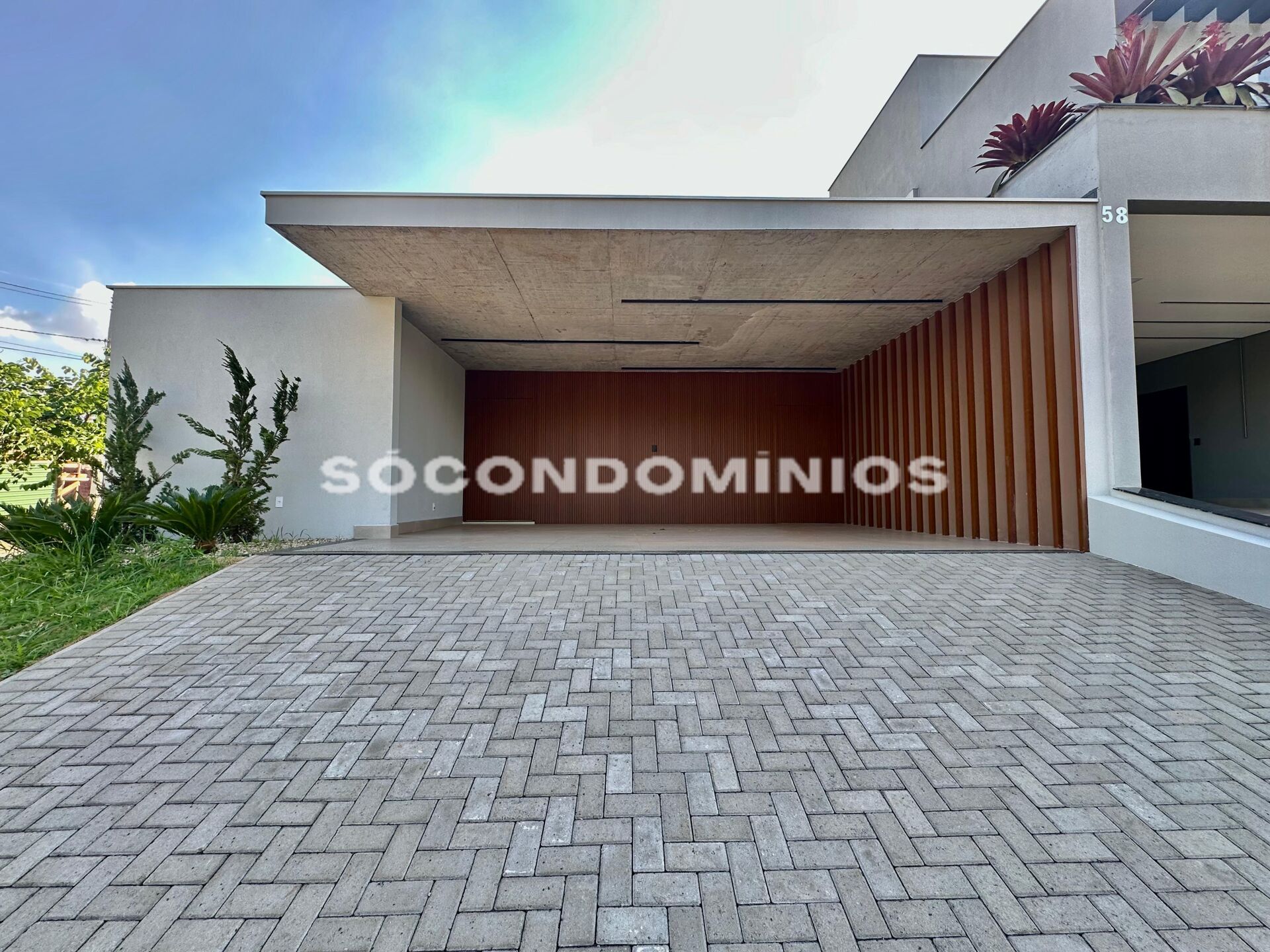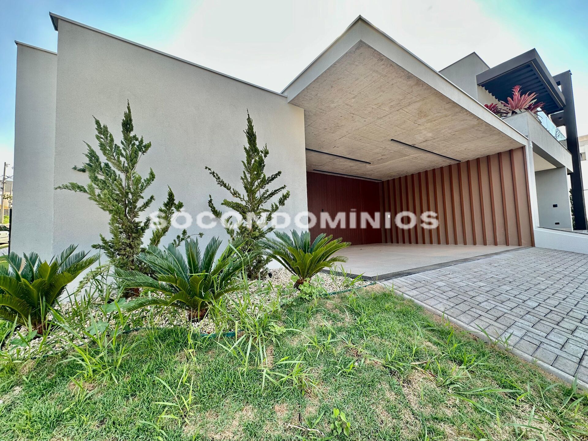 Garagem para 4 carros (2 cobertos e 2 descobertos) decoração em ripado e concreto aparente, iluminação embutida estilo contemporâneo.