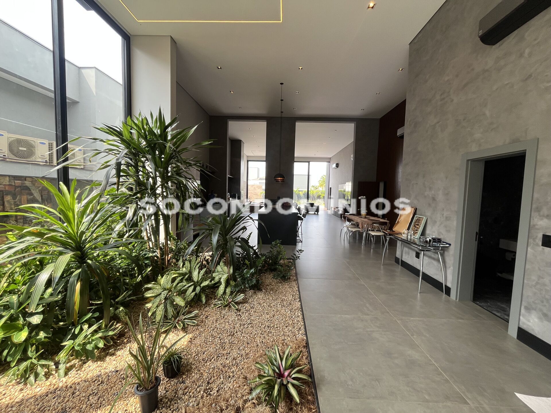 Cada ambiente respira conforto, graças ao ar-condicionado que abraça toda a casa. A área social eleva-se com pé direito de 5,5m, enaltecendo a sensação de grandiosidade.