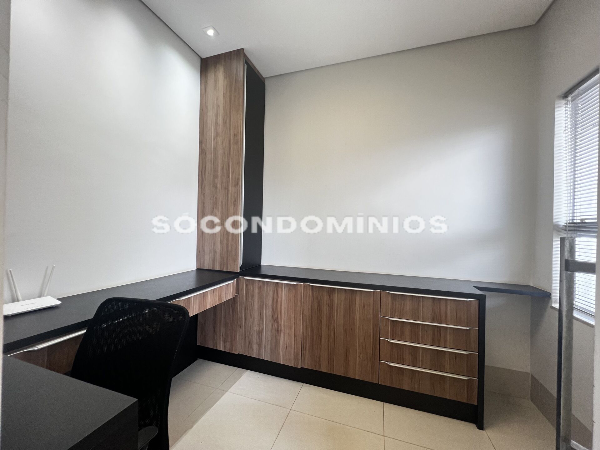 No piso superior um mezanino com sala de TV, escritório, 1 dorm c/ suite, sacada, closet.