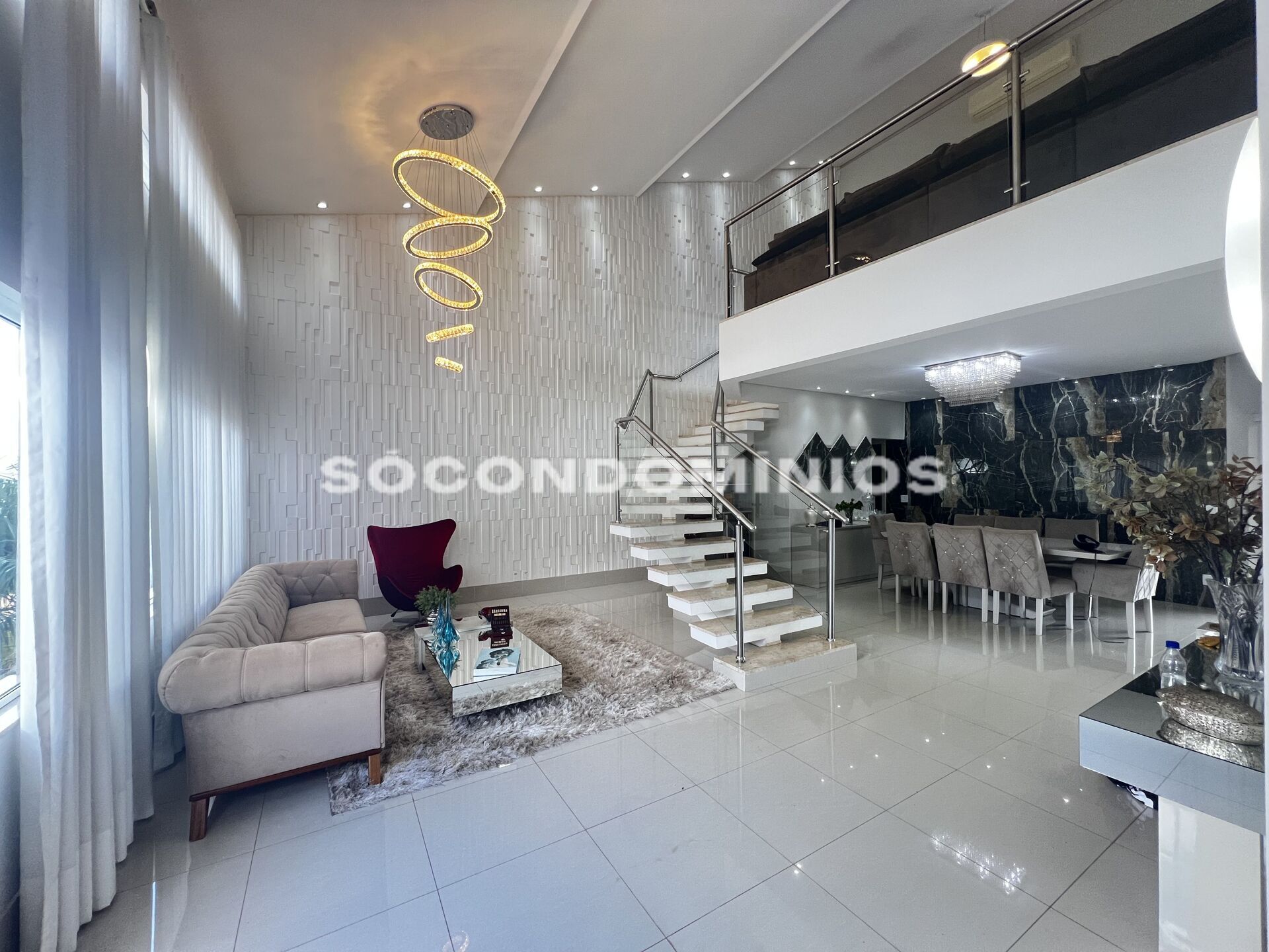 Sala de estar com pé direito duplo, sala de jantar e adega, escritório e lavabo.